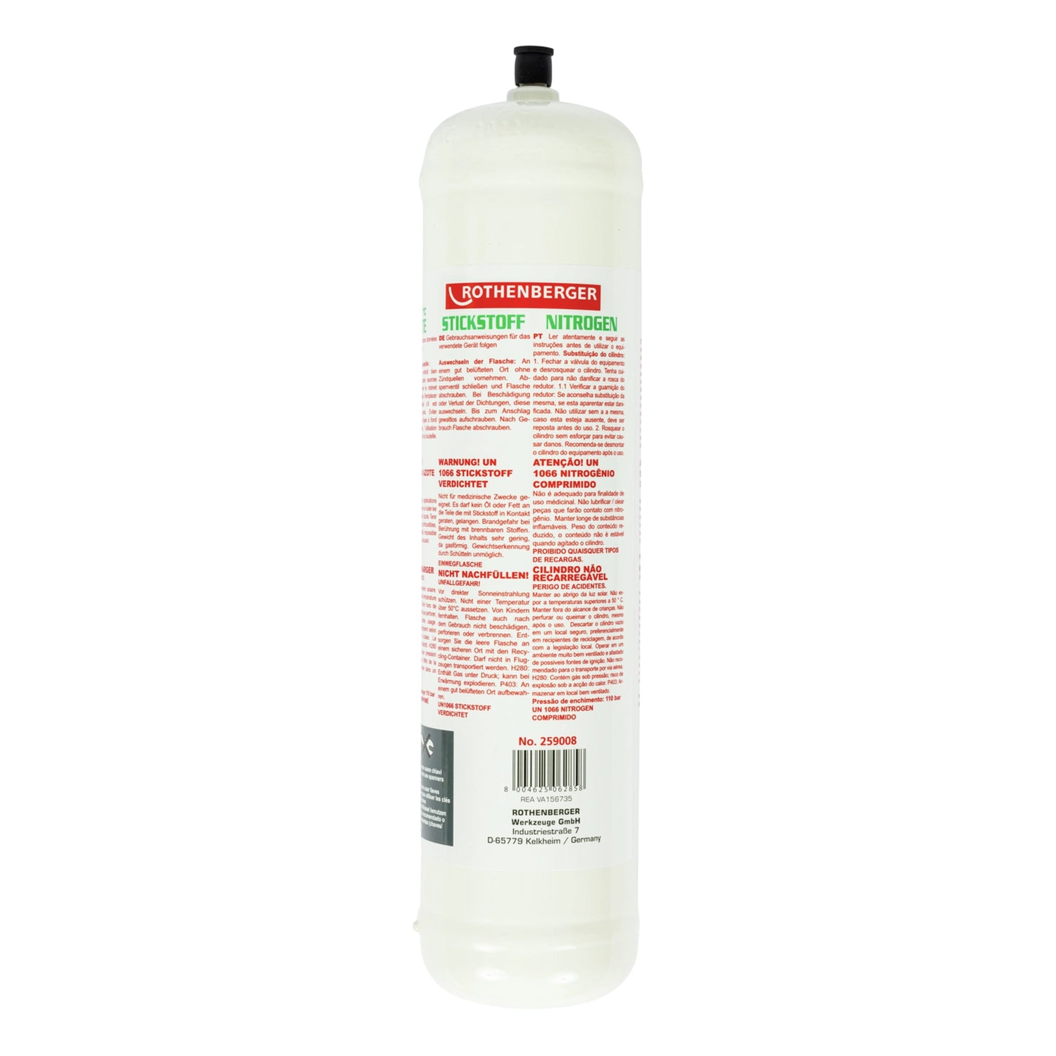 Nitrogen cylinder Rothenberger 950 cm³ 110 bar, nitrogen cylinder ideal for applications on air conditioning, refrigeration and heat pump systems. For leak detection and fluxing in the welding phase.