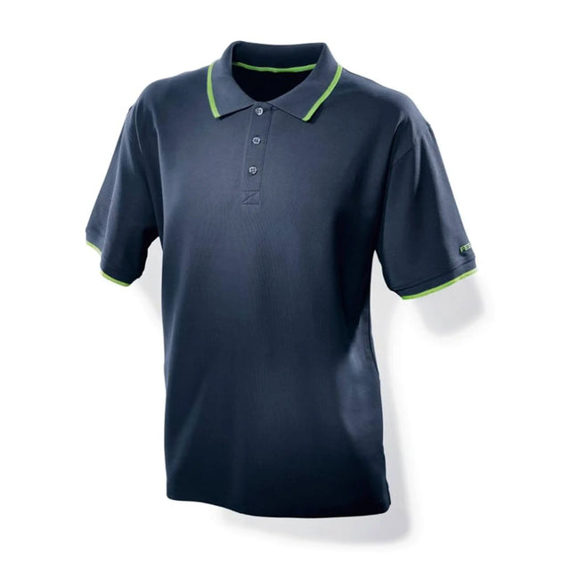 With dark blue color, green details inside the collar and logo Festool High-quality printed on the shoulder and sleeve, the polo shirt conveys a sense of belonging to a premium brand and construction site durability.