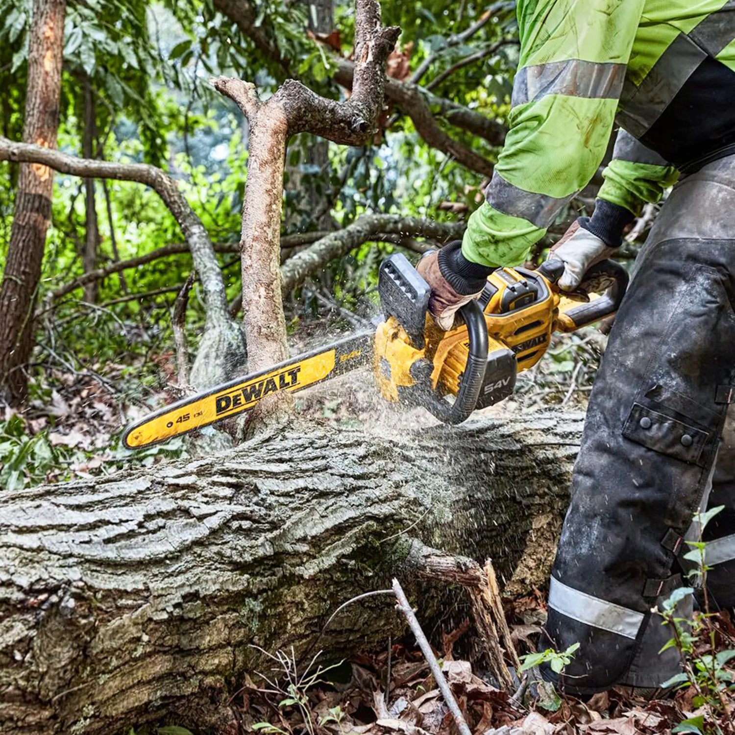 Electric saw Dewalt DCMCS574X1-QW 54V 9Ah with 45cm bar with a battery life of up to 115 cuts per charge (with 15Ah battery).