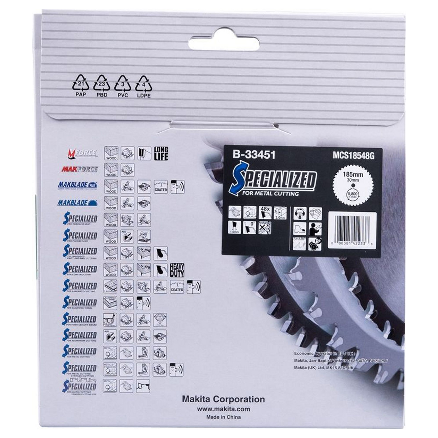 Specialized TCT Blade Makita B-33451 185x30mm 48T professional metal cutting saw with tungsten carbide teeth and anti-kickback design.