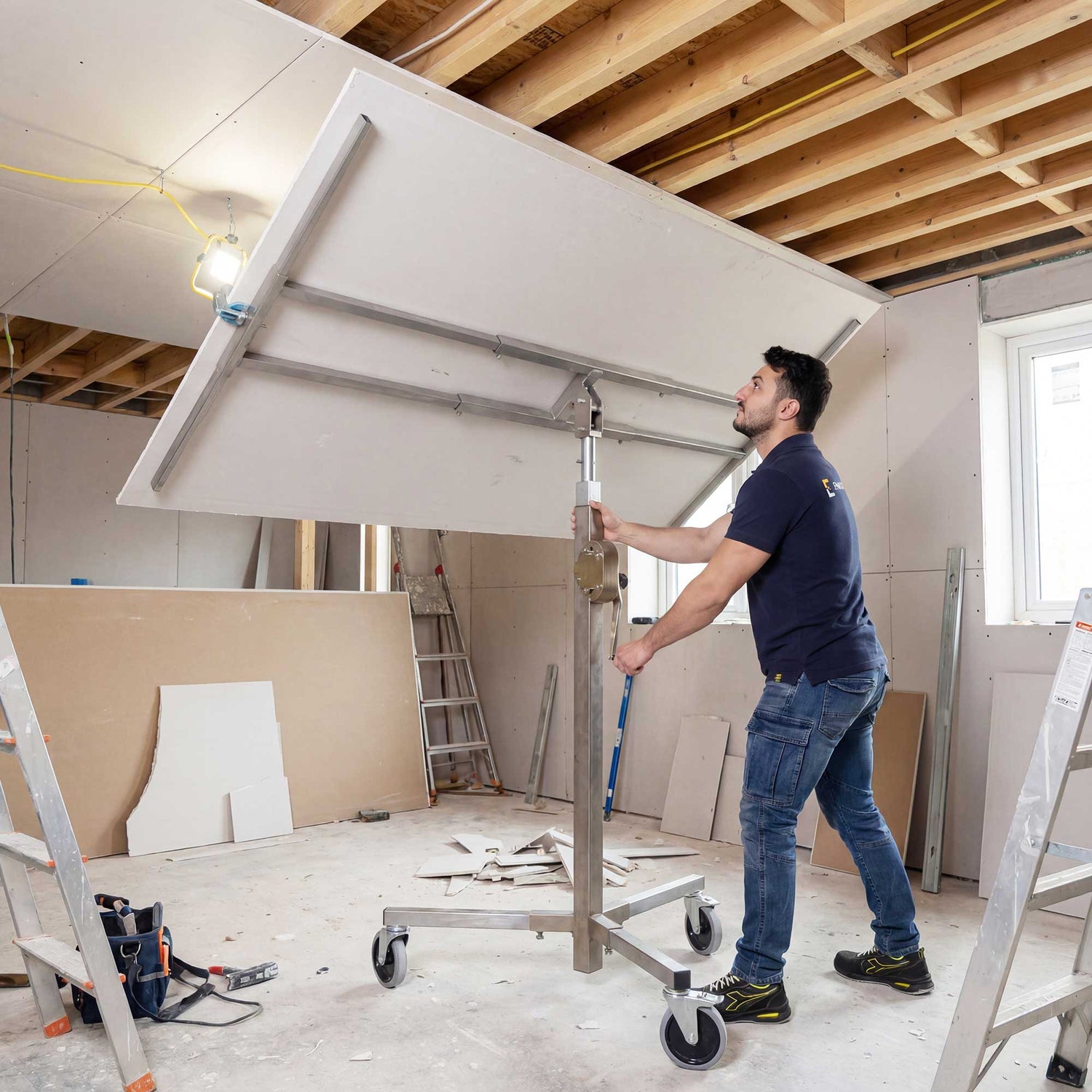 • Plasterboard Installation: Perfect for lifting and fixing plasterboard panels on high ceilings and walls, making assembly quicker and safer.