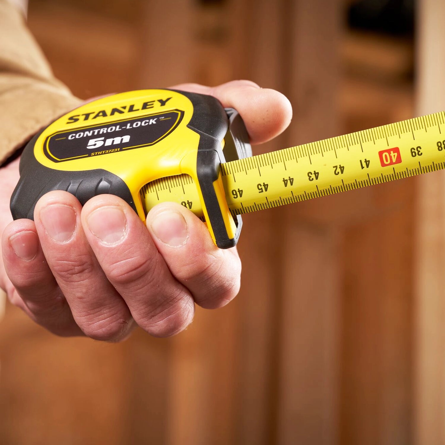 Tape measure Stanley STHT37231-0 from 5 meters llight and compact with rubber coating. Tape measure CONTROL-LOCK™ belt width 25mm.