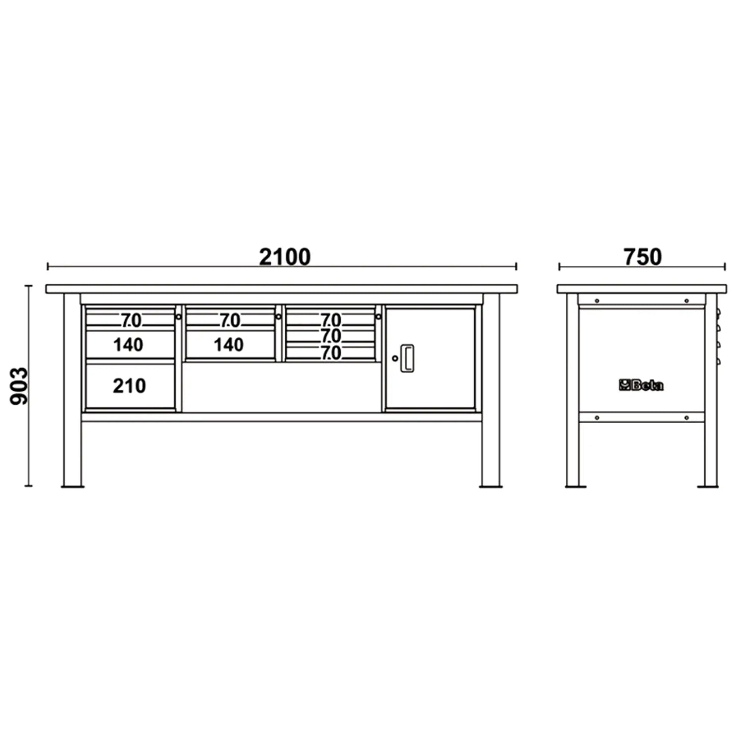 The Beta The C58BC-X2,1 4CA is designed to create a complete and functional workstation, with a stainless steel-covered MDF top, 4 drawers on ball-bearing telescopic slides, and a cabinet with a door. Thanks to its steel structure and load capacity of up to 800 kg, it is suitable for heavy-duty work and intensive use.