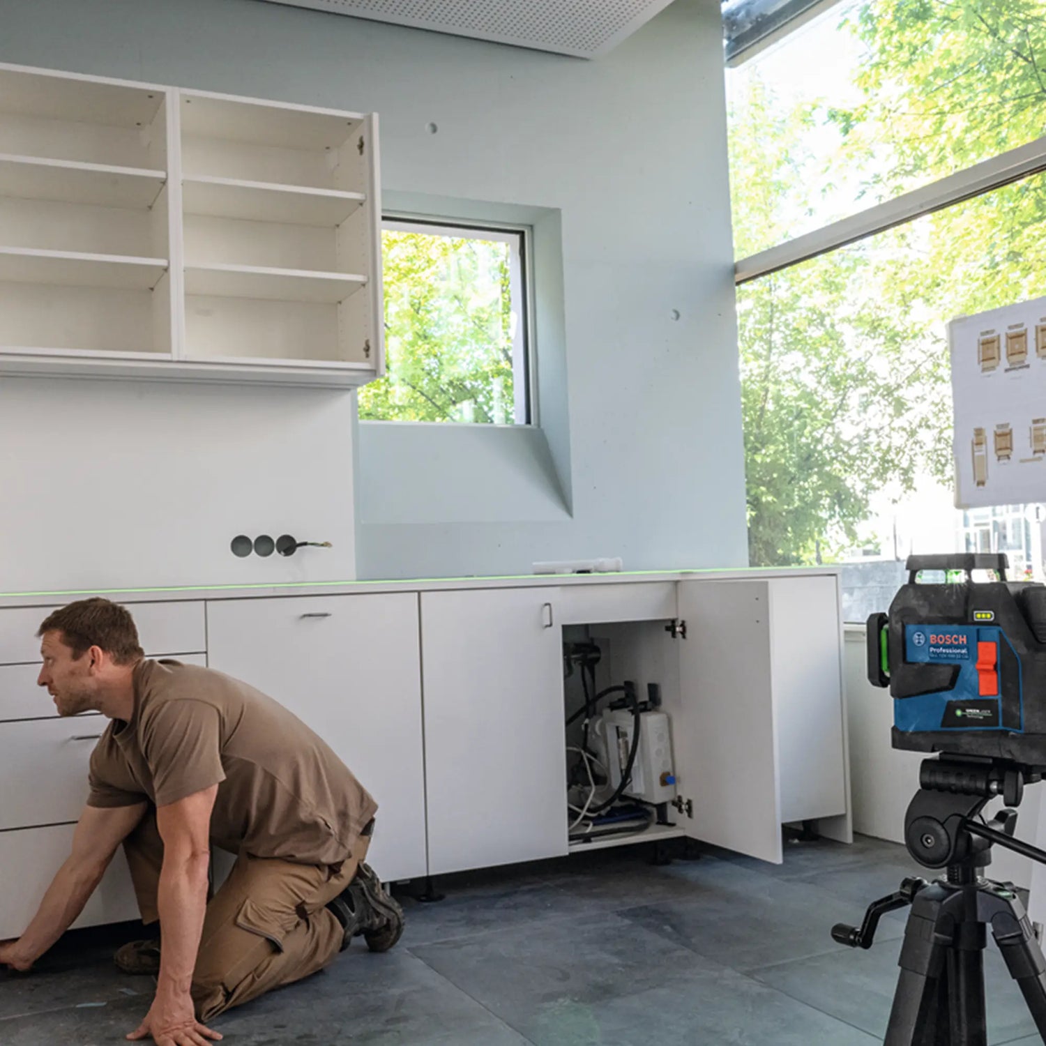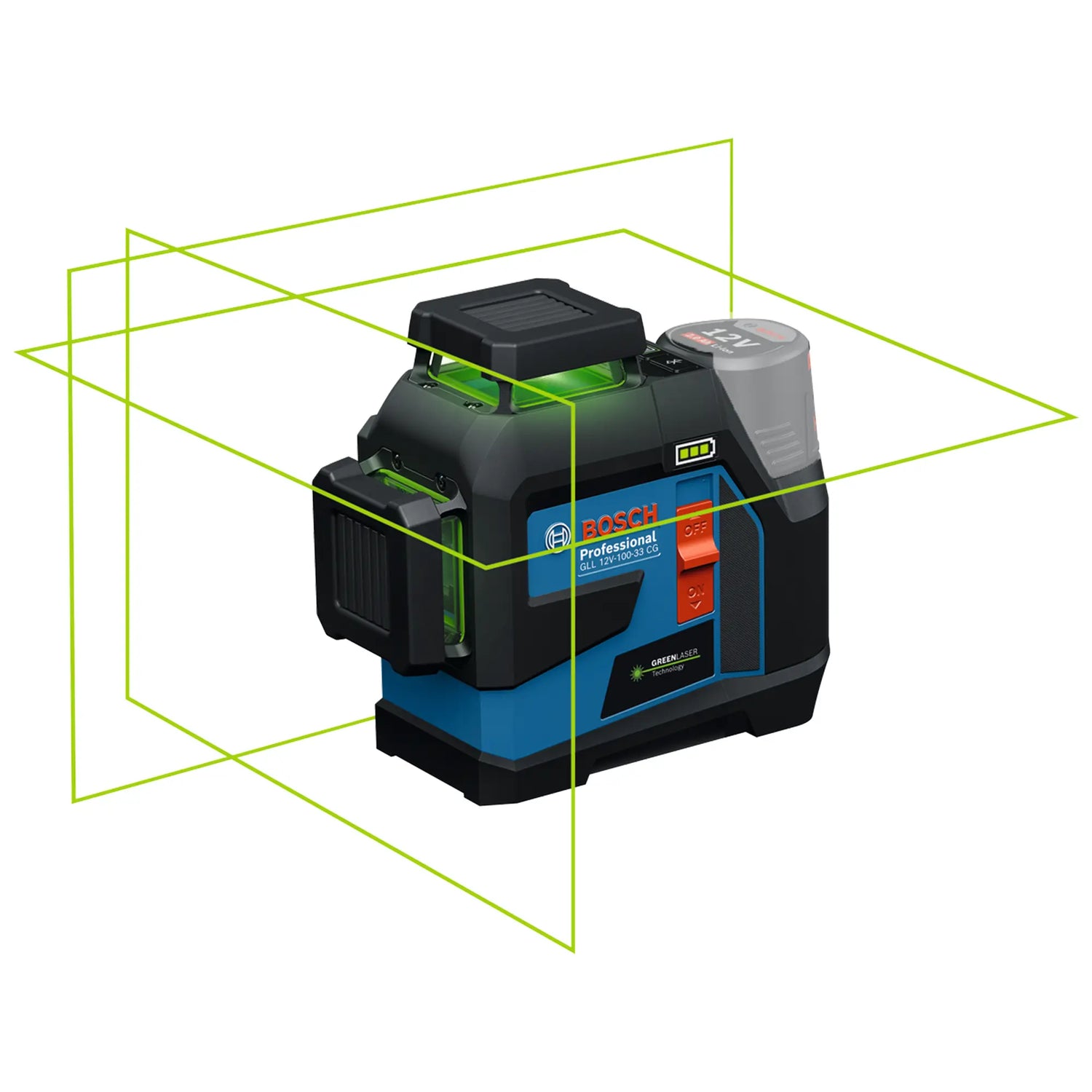 Livella Laser Bosch GLL 12V-100-33 CG 12V con 3 linee verdi a 360°, controllo remoto app e doppia alimentazione per massima versatilità.