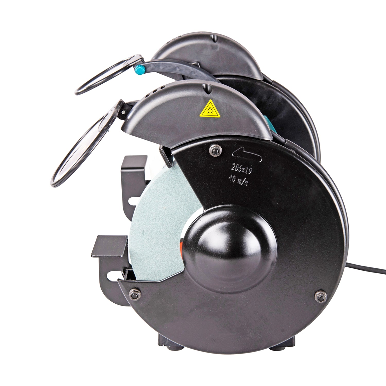 Bench Grinder Makita GB801 550W offering extra efficiency. Double splinter guard, one with magnifying glass. Double light to illuminate the work area.