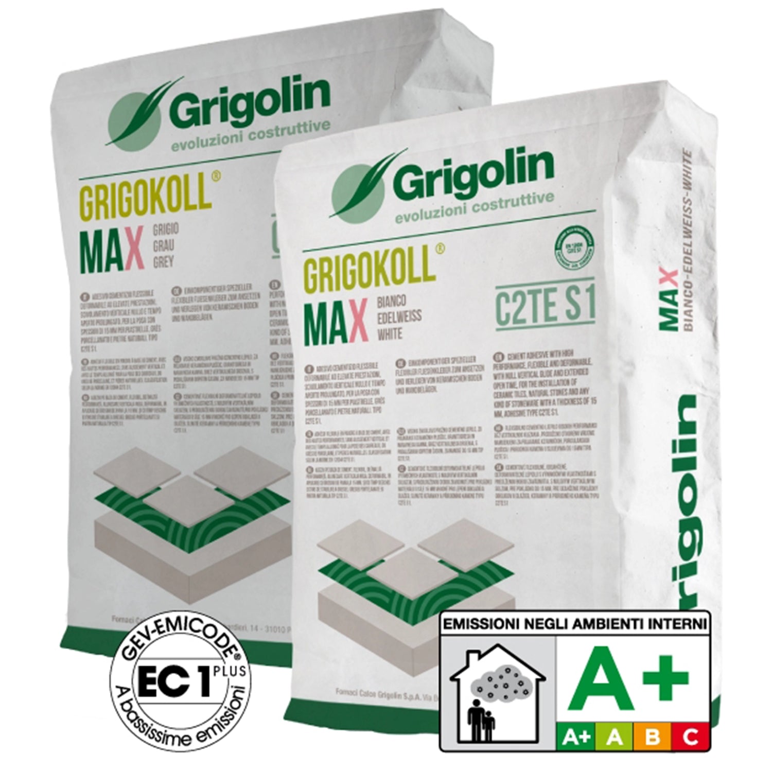 Glue Grigolin GRIGOKOLL MAX 25kg, C2TES1 classified glue sold in 25kg bags.