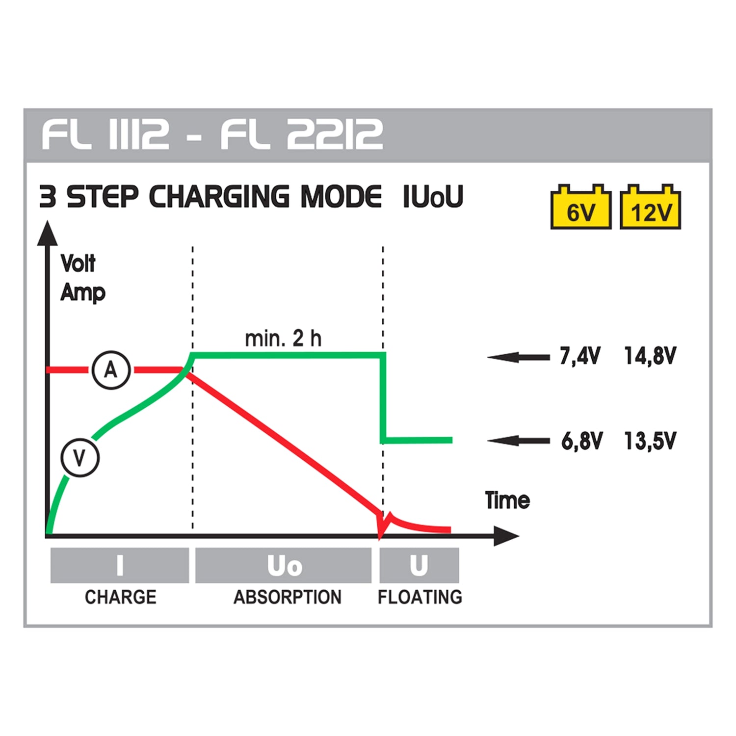 Inverter Battery Charger Deca FL 2212 with electronic control of the charging current and "Floating" charge maintenance. Suitable for charging lead-acid batteries: WET with and without maintenance, AGM, AGM Power, GEL, Start & Stop, Ca/Ca.