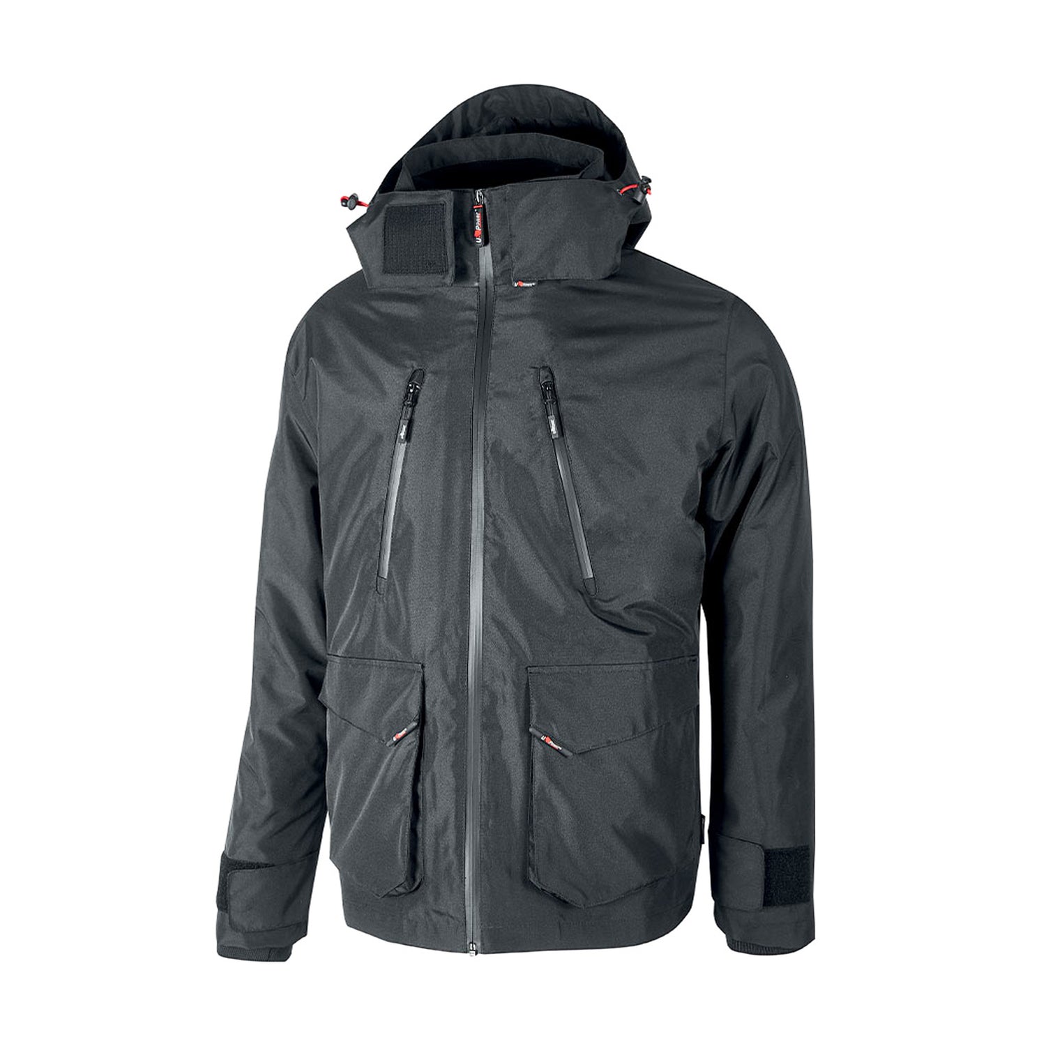 Jacket U-Power Forex, waterproof and breathable rain parka. 2 large front pockets applied to the bottom closed with flap and velcro, 2 chest pockets closed with water-repellent zip.