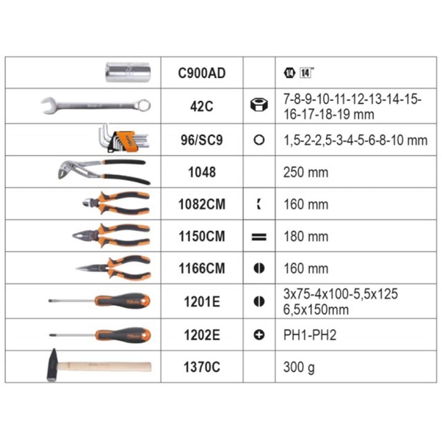 Combination wrenches, pliers, screwdrivers, hammer, Allen keys, and more.