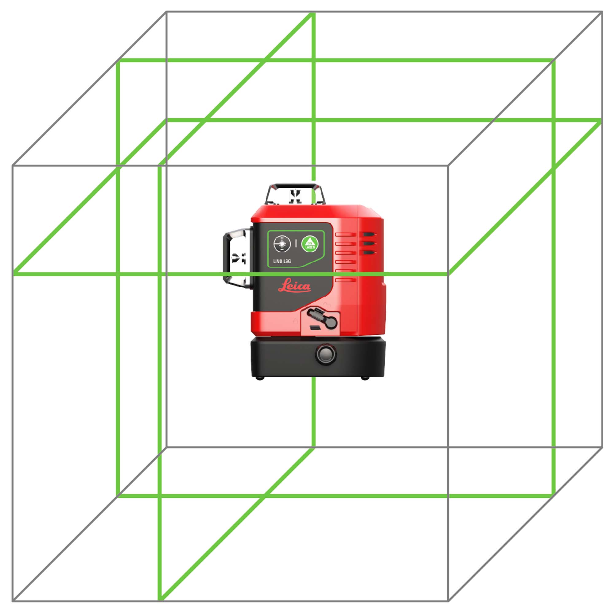 - One horizontal green laser line and two vertical 360° lines