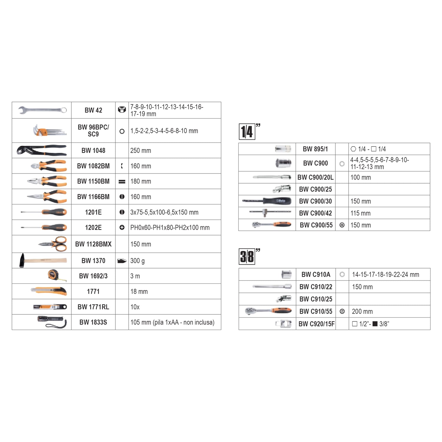 Special accessories: Each case offers a range of special tools, such as the kit 860EA/31 in 2054E 100 and a High Brightness LED Flashlight in BW 2054E-128.