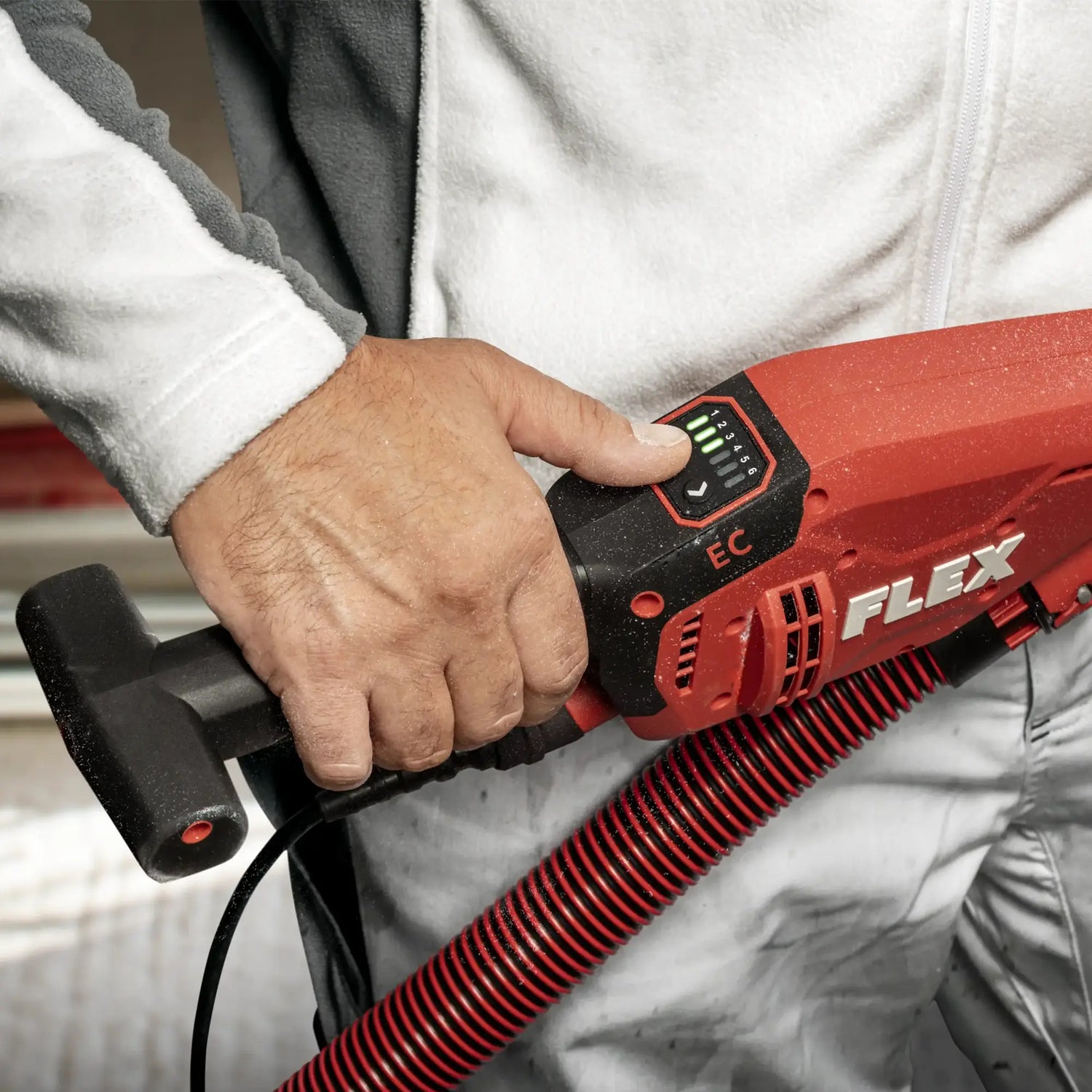 The Flex The GE 6 R-EC is used for professional sanding of drywall, plaster and masonry surfaces on walls and ceilings, allowing for precise and uniform work. In combination with the VCE 33 M AC extractor it guarantees effective dust control and a safer and more orderly work environment.